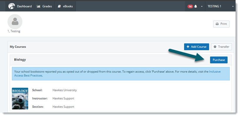 Once your purchase is completed, return to your Dashboard and your course access will be restored along with any completed assignment grades.